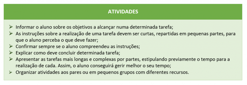 Dado que as crianças com PHDA têm dificuldades em organizar a informação, as atividades devem ser apresentadas de forma simples, com instruções curtas, claras e diretas.