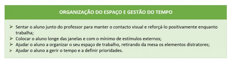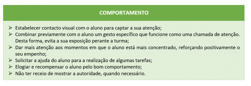 O professor deve dar mais atenção ao aluno, nos momentos de maior concentração, reforçando positivamente o seu comportamento. Na maioria das vezes, ignorar os comportamentos desadequados e reforçar os comportamentos desejáveis ajudará o aluno com PHDA a aprender a gerir o seu comportamento.